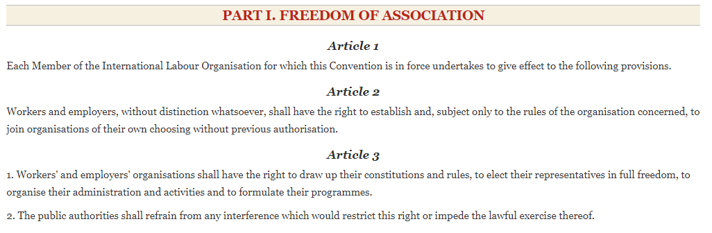이 또한 노동조합의 구성은 조합이 구성한 원칙에 의한다는 ILO 핵심협약 87호에 근거한다. 정부는 임원 선출은 노동조합의 규약에 따르되, 일반 조합원과는 다르게 해당 업종의 종사자인 근로자로 제한하였다.