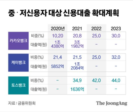 카카오뱅크와 케이뱅크는 2023년 까지 중저신용자 대출 비중을 총 대출의 30%이상으로 확대하고, 토스뱅크는 영업 첫해 34.9%에 맞추겠다고 했다.