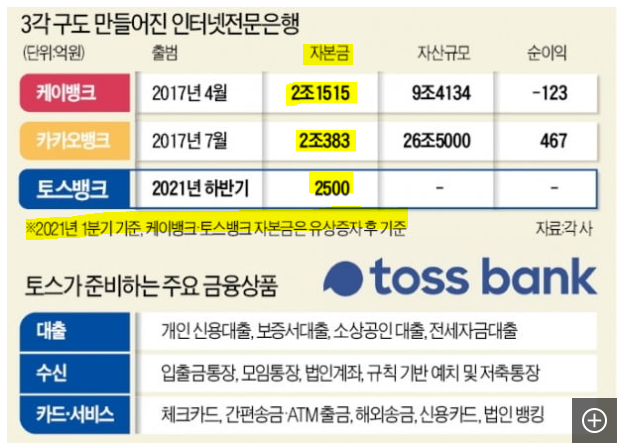 (카카오뱅크, 케이뱅크 자산은 합산하여 국민은행의 8% 밖에안되고, 자본금은 2조원으로 30조원의 국민은행에 10%도 안된다.)
