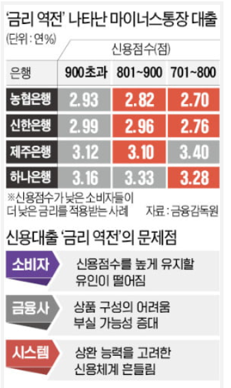 신용도가 낮은 사람에게 이자를 더 받는건 금융의 상식이다. 하지만 이 같은 대출금리 역전 현상이 일반화할 경우 신용도에 따라 금리가 책정되는 신용 시스템 전체가 흔들릴 수도 있다.