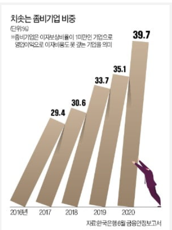 지난해 좀비기업은 상장 비상장기업 가운데 39.7%로 2019년보다 4.6%포인트 증가했다.