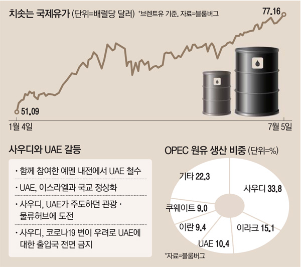 양국 갈등은 유가 불안 요인으로 작용할 전망. 로이터통신에 따르면 당장 8월 증산 여부가 불투명하다고 전함. 증산 합의 불발로 국제유가는 2018년 이후 최고로 치솟음. 북해산 브렌트 유 9월 인도분은 배럴당 77달러 돌파.