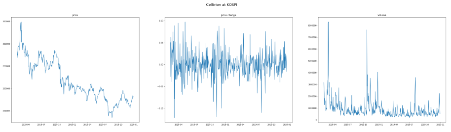 우선 셀트리온이 KOSPI로 이전한 2018년 2월 9일부터 현재(2019년 12월 31일)까지의 주가 정보를 가져왔다.
