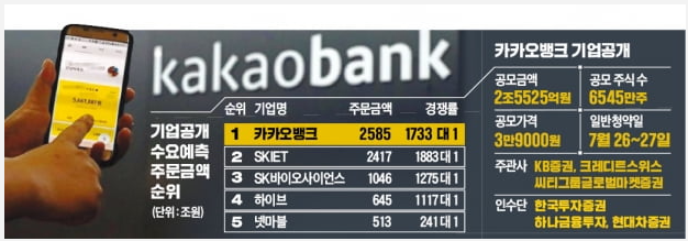국내 인터넷은행 최초로 상장에 나선 카카오뱅크에 2585조원의 기관투자가 자금이 몰렸다. 국내 기업공개(IPO)시장에서 진행된 기관 수요예측 사상 최대 주문 기록이다. 예상을 웃도는 기관들의