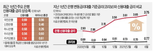 1일 은행 연합회에 따르면 5대 은행과 카뱅의 지난 6월 취급한 일반신용대출 금리는 연 2.81~3.95%였다. 1년전에 비하면 평균 0.71%포인트 올랐다. 신용점수에 따라 1~2%포인트 오른 사람도 속출하고 있다.