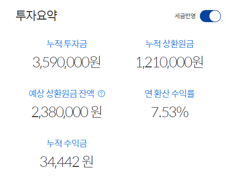 현재 세후 기준 7.53%의 연환산 수익률을 거두고 있는데 필자의 투자 전략 상 연체 및 부도 위험이 낮은 상품들만 투자하고 있다는 점을 고려하면 만족할 만한 수익률이다. 또한, 만기가 1~2개월 정도 되는 상품이 대다수를 차지(SCF 상품류)하므로 복리 효과를 누릴 수 있다는 장점이 있다. 아래의 이미지에서 알 수 있듯, 현재 투자금이 300만 원에 불과한데 누적 투자금은 359만 원이다.