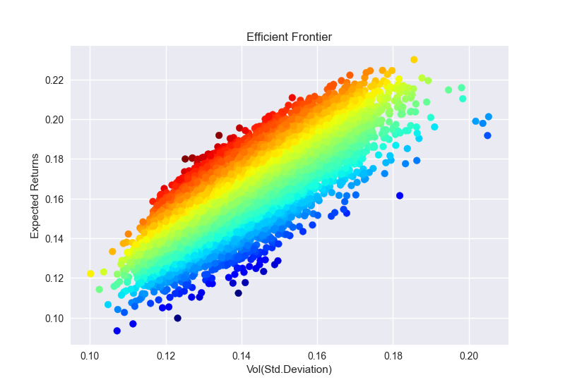 앞서 만들어본 포트폴리오 와는 다르게 빨간색 점들을 기준으로 수익률은 다소 떨어지긴 하였으나 (16%) 표준편차가 내려간 것을 확인해볼 수 있다. (표준편차 0.12 이상)