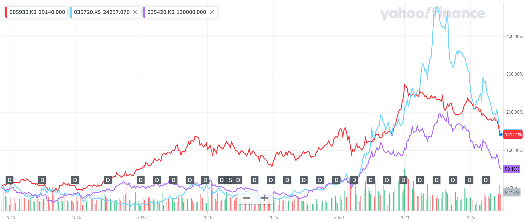 tickers = ['005930.KS','035420.KS', '035720.KS']