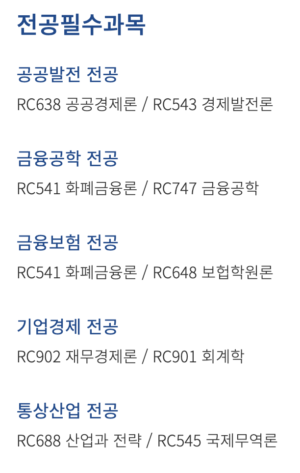 - 세부 전공: 금융공학, 금융보험, 공공발전, 통상산업, 기업경제 총 5개 전공. * 다만, 전공별 차이가 크지는 않다. (전공필수 과목이 다른 정도이며, 졸업 논문 작성 시 세부 전공과 다른 주제를 선택해도 상관없다고 한다.)