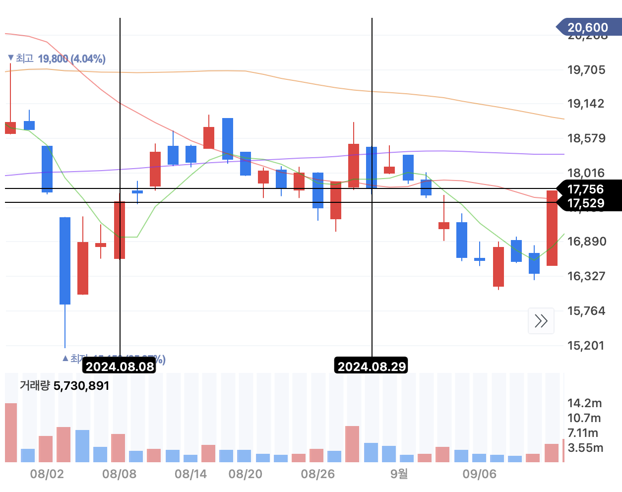 | 종가 | 17,540원 | 17,750원 | 1.2% | |