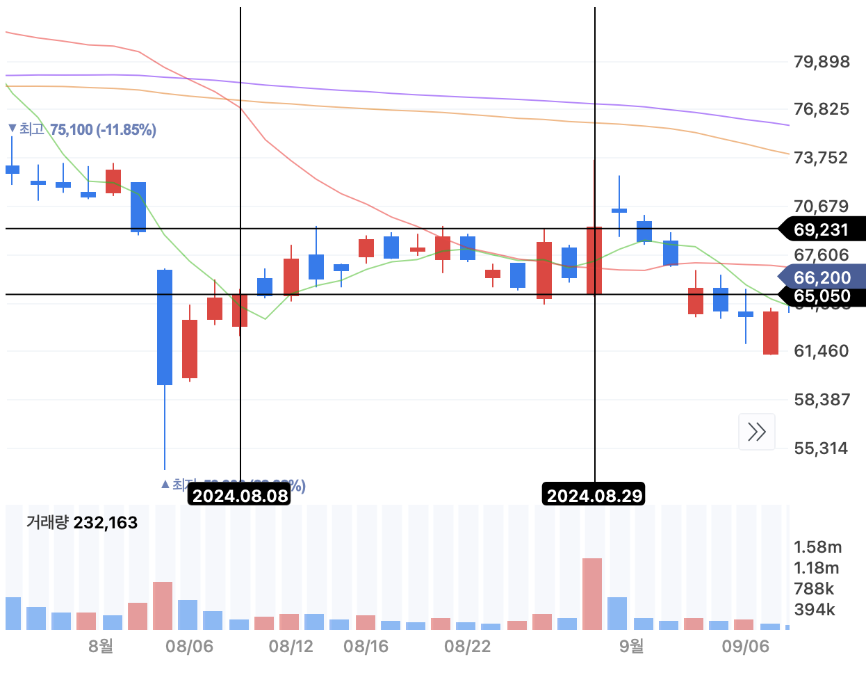 - 매수 시점 및 가격 (1차 매수) 24.8.8. 37,100원 (2차 매수) 24.8.9. 38,300원 (3차 매수) 39,200원 - 매도평균가: 42,385원