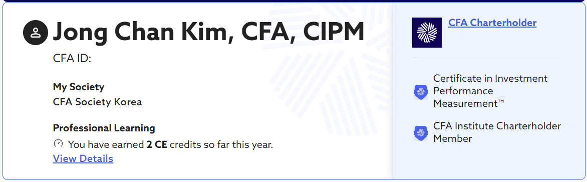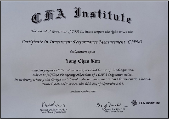3년 동안의 근무를 통해 결국 CFA Charteholder가 되었고 그리고 내가 근무하는 주전공인 포트폴리오 성과평가와 관련된 유일한 자격증인 CIPM Certificate도 취득했다. 오늘은 그동안 근무하며 느낀 CFA 자격증에 대한 이야기와 더불어 지금 내 커리어와 연관된 CIPM 자격증의 취득 그리고 내 개인적인 생각들을 작성하고자 한다.