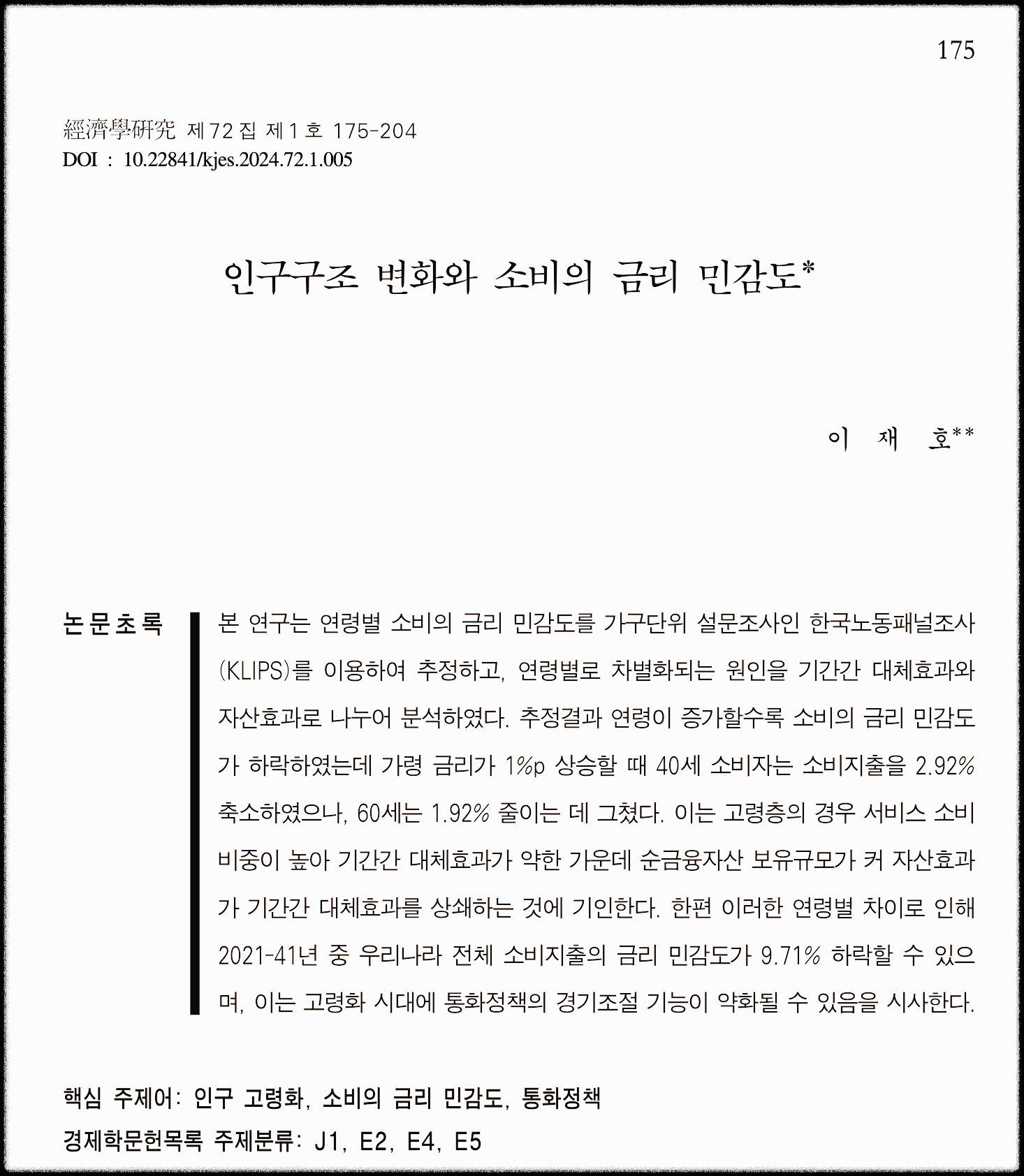본 포스팅은 한국경제학회 경제학연구 제72집 제1호에 실린, 이재호 한국은행 조사국 조사총괄팀 과장의 <인구구조 변화와 소비의 금리 민감도> 논문의 내용을 요약 및 정리한 것입니다.