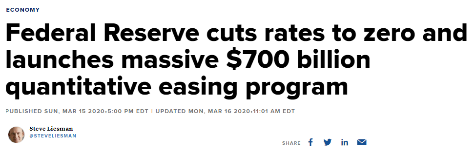 - FED는 코로나 19 바이러스가 미국을 포함한 수많은 나라에서 경제활동과 사회활동에 해를 끼치고 있다고 말하며, 일요일 긴급히 기준금리를 제로 포인트 가량으로 내렸고 7000억 달러 가량의 양적 완화 프로그램을 경제를 보호하기 위해 실행한다고 발표했다.