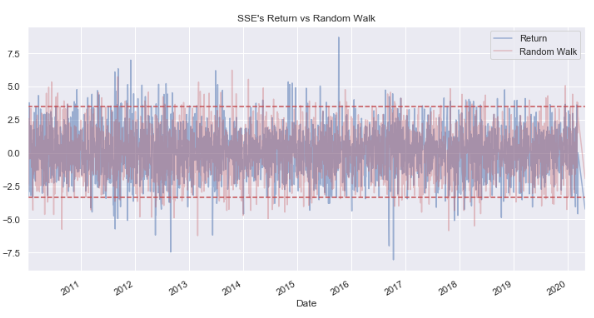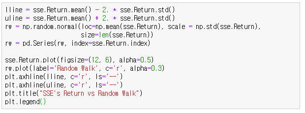 위를 통해 알 수 있듯이 삼성전자 주가의 수익률은 정규분포를 가정하고 그린 랜덤워크 보다 이상값이 자주 관측되고 있다.