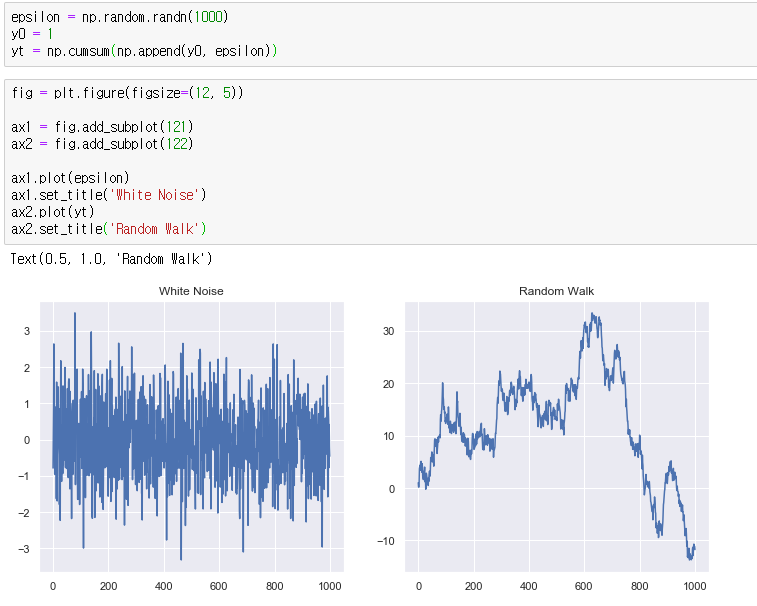 - Autoregressive Model(AR모형): 현재 시계열이 과거 시계열 데이터에 종속되는 모형. 데이터는 random walk와 유사하다. 평균회귀 특성을 가진다.